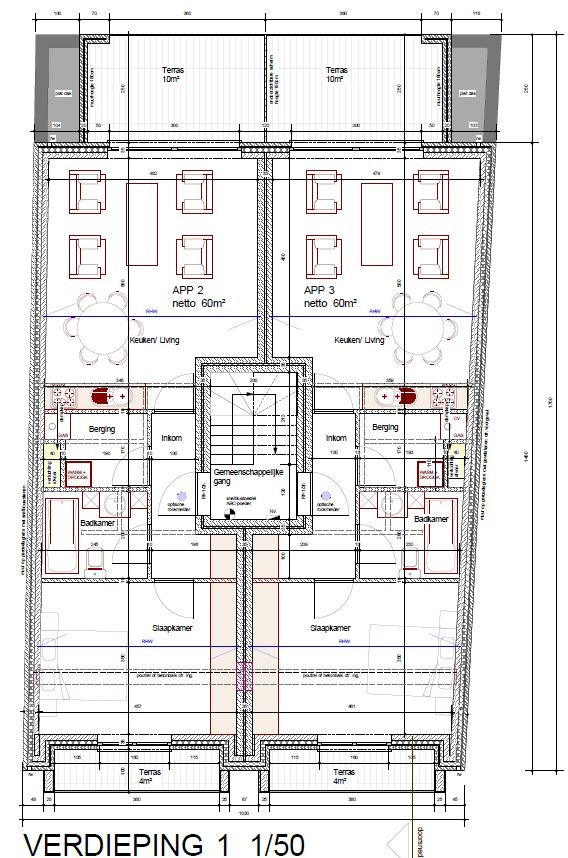 De ruime slaapkamer biedt voldoende plaats voor een garderobe, een groot tweepersoonsbed en eventueel een bureau. In de inkomhal bevinden zich de berging/wasplaats, de badkamer met douche en toilet, en een vestiaire. Aan de straatzijde van het gebouw ligt de slaapkamer, terwijl de grote leefruimte met open, volledig ingerichte keuken uitkijkt op het achterliggende terras met veel privacy. Het gebouw bestaat uit vijf appartementen, waarvan er nog één éénslaapkamerappartement beschikbaar is. Huisdieren zijn niet toegelaten.