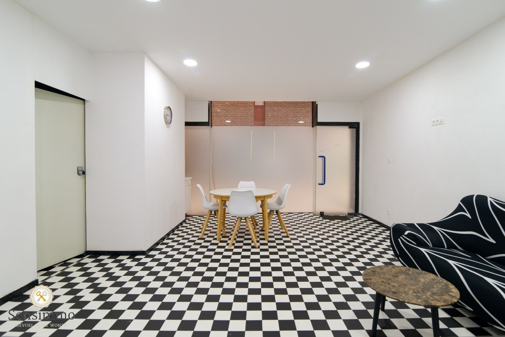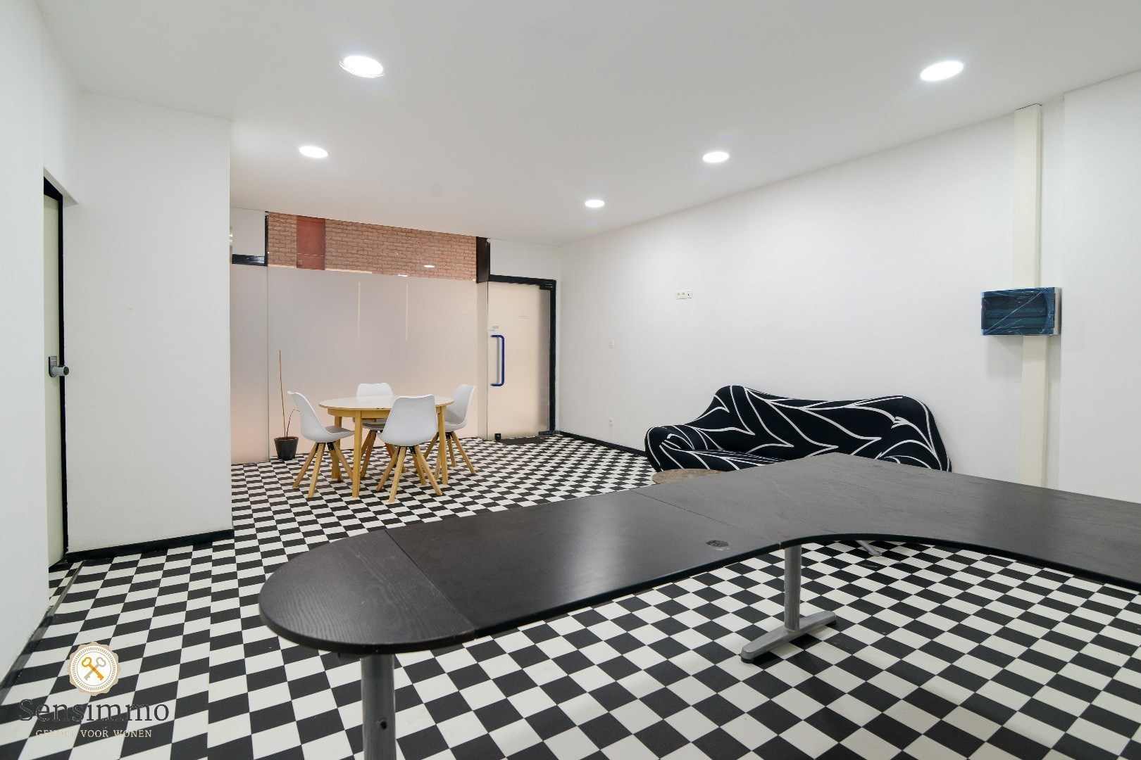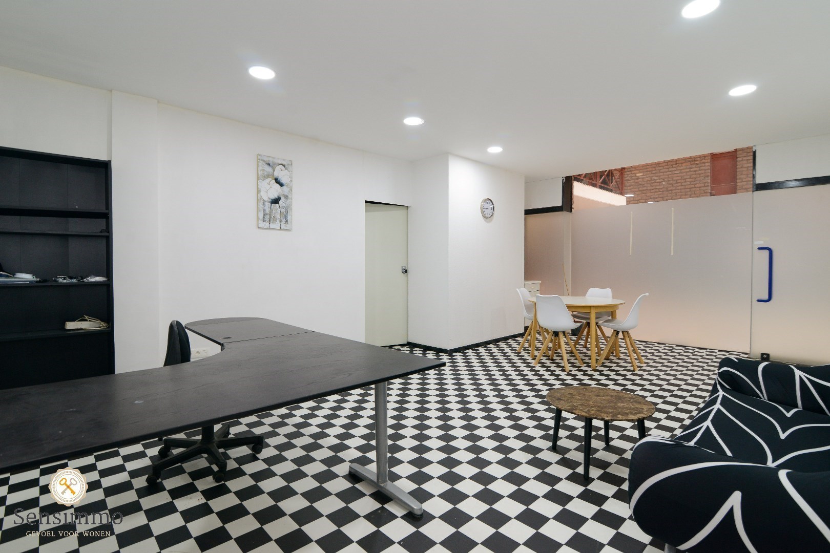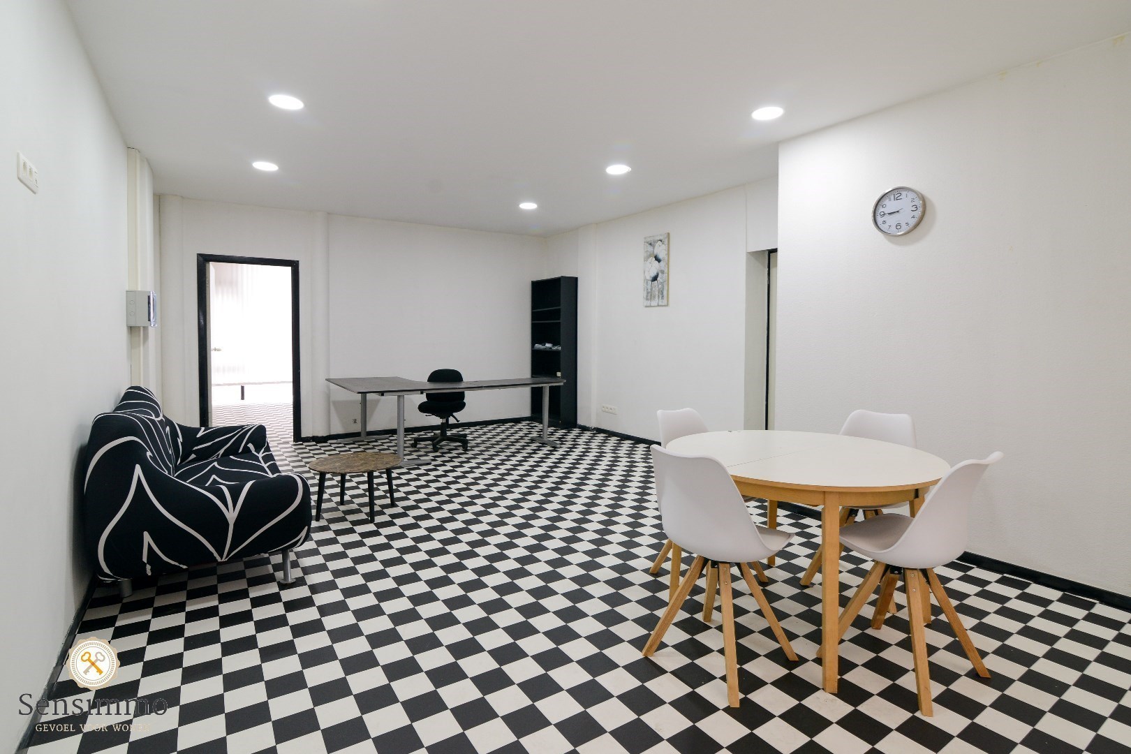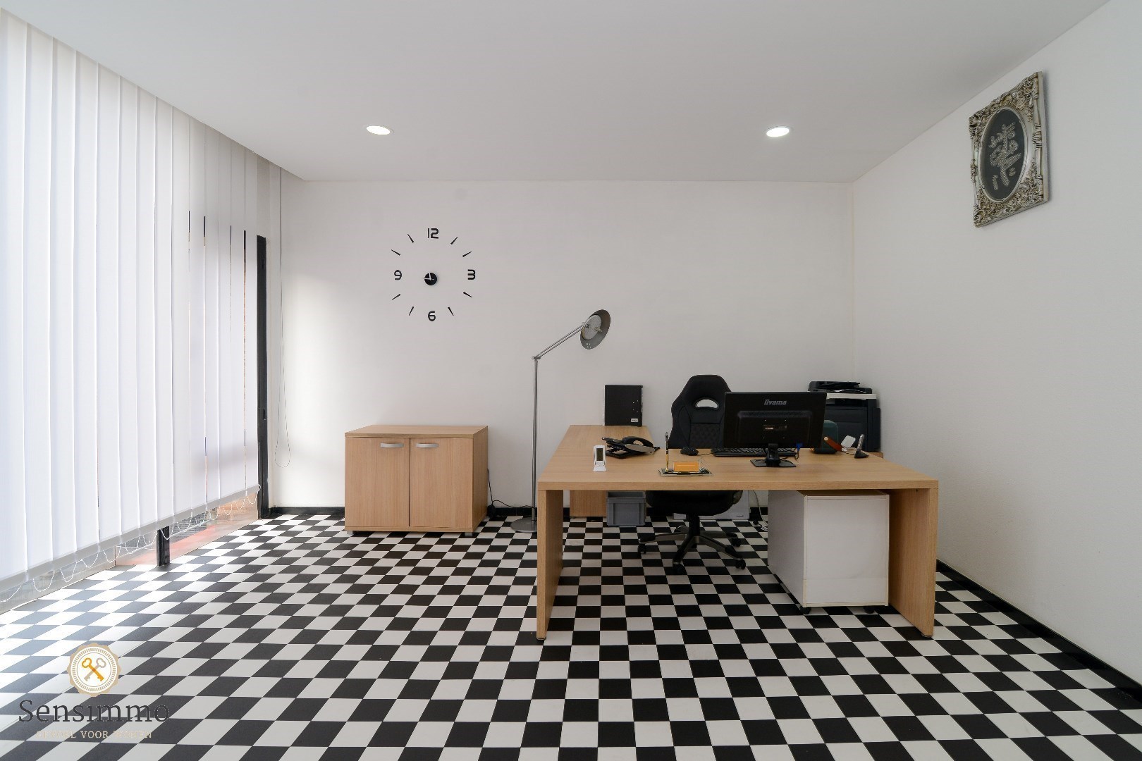 Bij binnenkomst valt de mooie open ruimte meteen op die voor verschillende doeleinden kan gebruikt worden. Momenteel ingericht als kantoor.