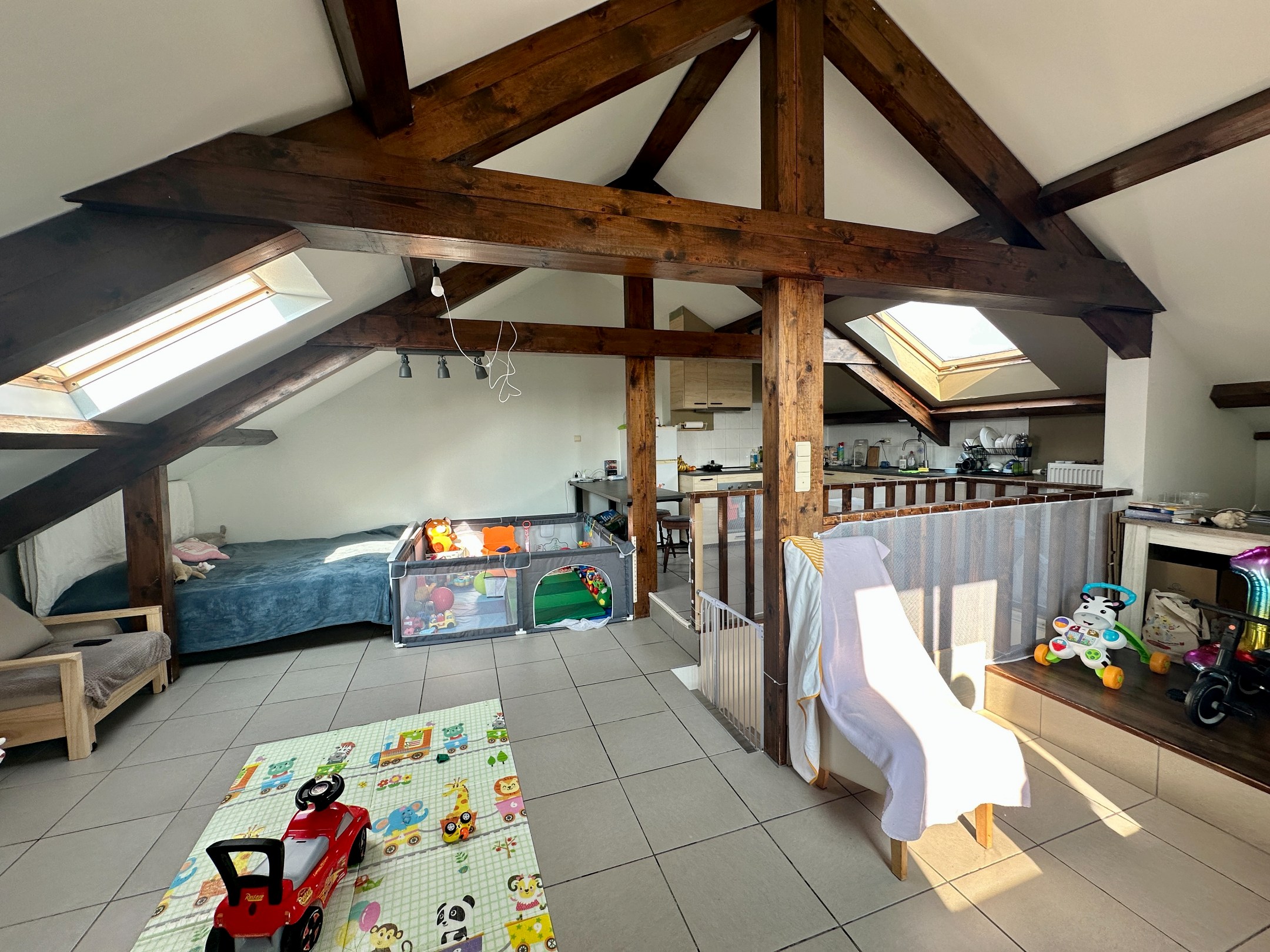 De woning zelf biedt een doordachte en functionele indeling. Bij het betreden komt u in de inkomhal met vestiaire, die meteen toegang geeft tot een ruime en praktische wasplaats. Op de eerste verdieping bevinden zich drie slaapkamers. Een verdieping hoger treft u de lichtrijke leefruimte met open keuken en een gezellige woonruimte, aangevuld met een handige studie- of werkhoek — ideaal voor wie thuiswerk wil combineren met comfortabel wonen.