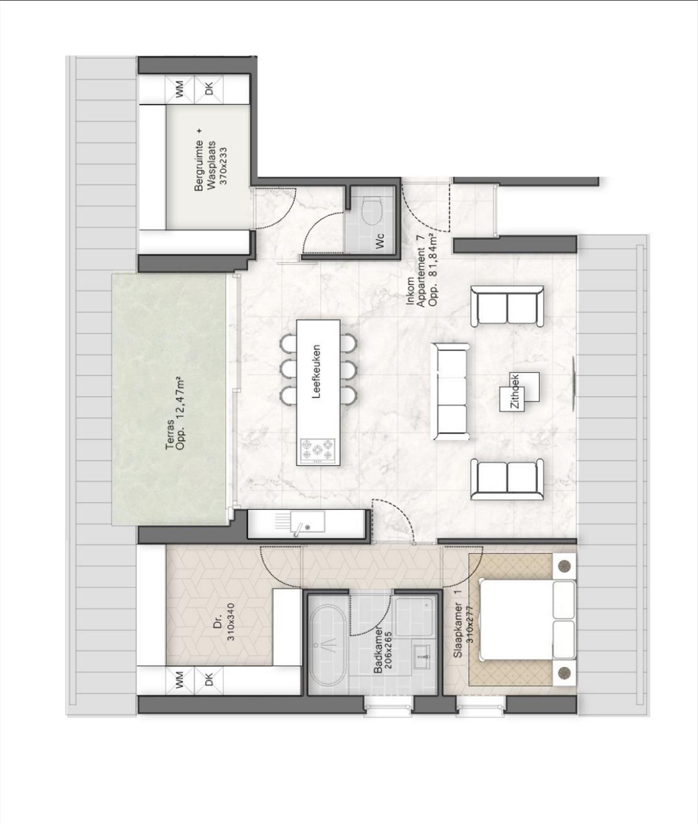 - Terras: Het appartement beschikt over een eigen terras met grootte van 12,50 m²