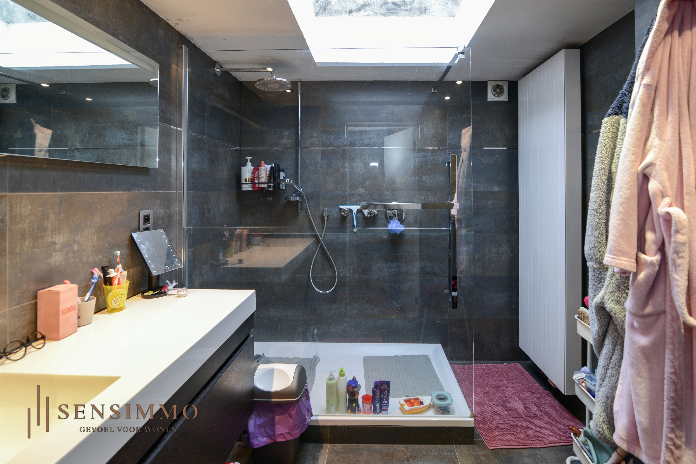 • Moderne badkamer met inloopdouche en dubbel meubel + toilet