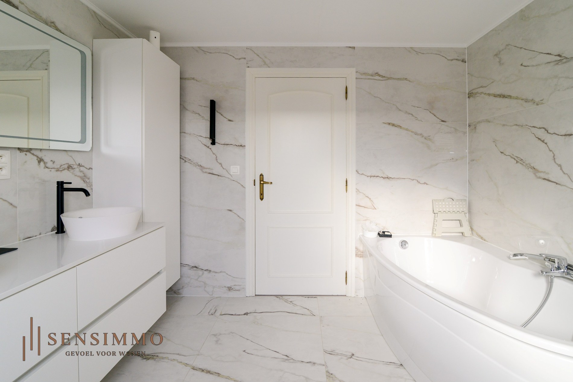 1ste verdieping: Hier treffen we 3 ruime slaapkamers die allen voorzien zijn van inbouwkasten op maat, ruime badkamer met badkuip, badmeubel met dubbele lavabo en toilet.